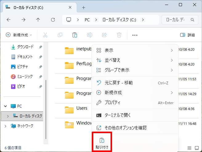 Cドライブを開き、空白の場所を右クリックして[貼り付け]を行います。