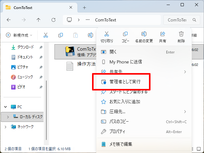 ダウンロードしておいた「ComToTxt」を右クリックして[管理者として実行]します。