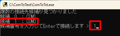 上の手順で確認した、デバイスマネージャーの[ポート (COMとLPT)]の[USBシリアルデバイス]のCOM番号の候補番号をキーボードで入力し、Enterキーを押します。