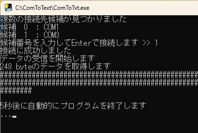 正しいCOM番号の候補番号を入力してEnterで実行すると、ComToTxtはバーコードリーダーの保存されているデータを確認し、自動的にPCへダウンロードしてファイルへ書込みます。動作が終了するとComToTxtは自動的に終了します。