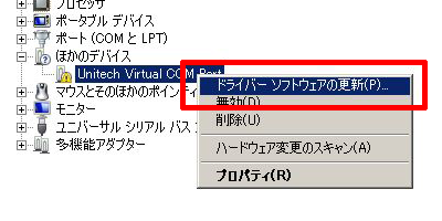 デバイス マネージャーの[Unitech Virtusl COM Port]を右クリックして、コンテキストメニューから[ドライバーソフトウェアの更新]または[ドライバーの更新]をクリックします。