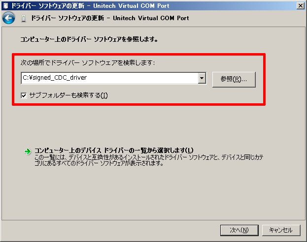 [参照]ボタンをクリックし、USB仮想COMドライバを展開したフォルダを開きます。
