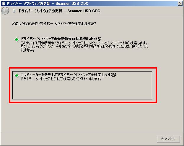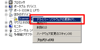 デバイス マネージャーの[Scanner USB CDC]を右クリックして、コンテキストメニューから[ドライバーソフトウェアの更新]または[ドライバーの更新]をクリックします。