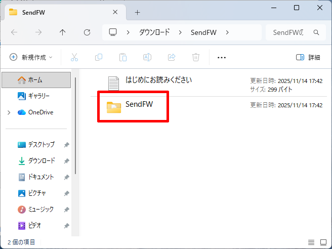 zipファイルを展開したフォルダが開きます。[SendFW]フォルダをダブルクリックして開きます。