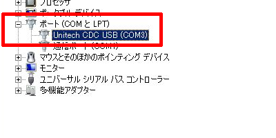 デバイスマネージャーの[ポート (COMとLPT)]に[Unitech CDC USB]が表示されていれば設定は完了です。横に表示されているCOM番号が、バーコードリーダーに割り当てられているCOMポートの番号です。このCOM番号は、後ほどSendFWのセットアップに使用します。