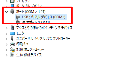 デバイスマネージャーの[ポート (COMとLPT)]に[USBシリアルデバイス]が表示されていれば設定は完了です。横に表示されているCOM番号が、RFIDリーダーに割り当てられているCOMポートの番号です。このCOM番号は、後ほどSendFWのセットアップに使用します。
