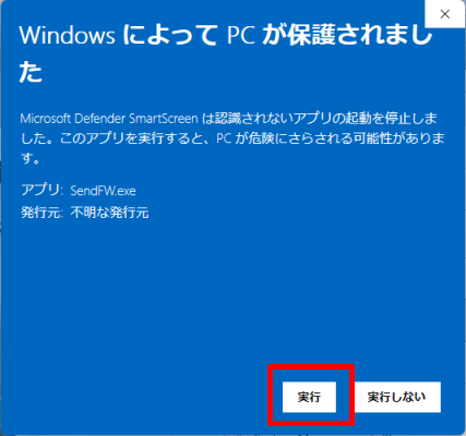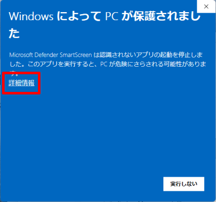「WindowsによってPCが保護されました」のメッセージが表示された場合は、[詳細情報]→[実行]ボタンをクリックして続行します。