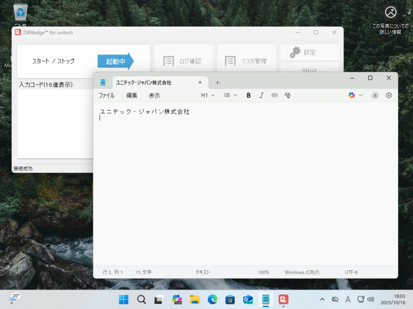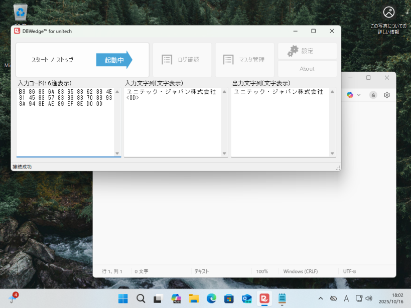 以降、DBWedgeの画面が最前面にある場合は自身の[入力コード]、[入力文字列(文字表示)]、[出力文字列(文字表示)]のボックスに読み取ったデータを表示し、他のソフトウェアが最前面にある場合はそのソフトウェアに読み取ったデータを入力します。