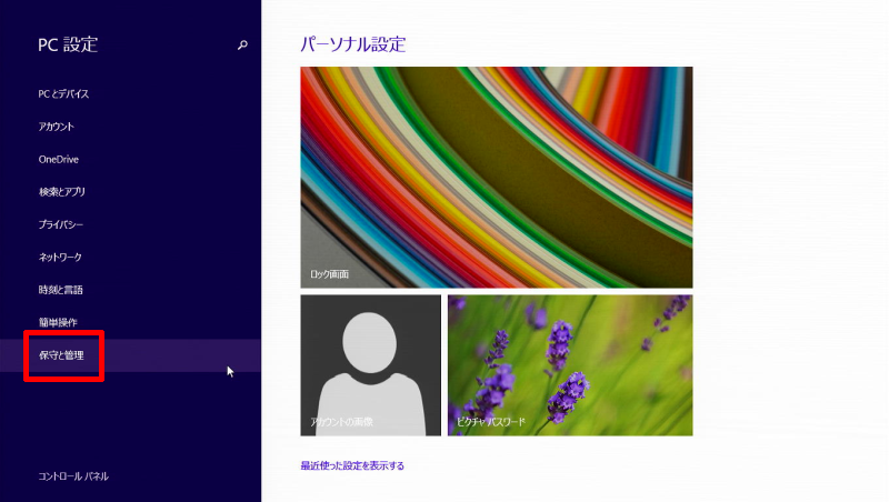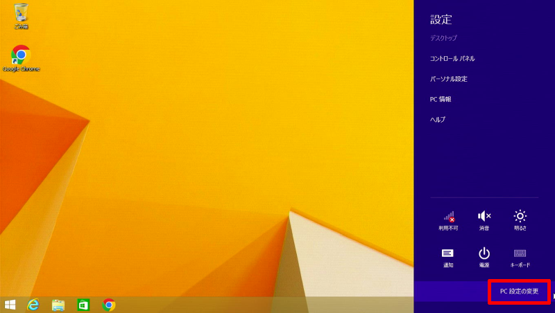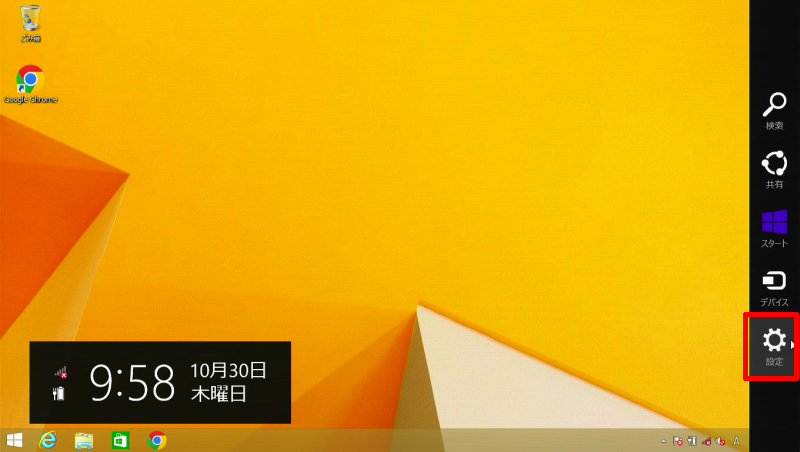 画面の右上隅か右下隅にマスカーソルを移動してチャームを表示し、[設定]をクリックします。