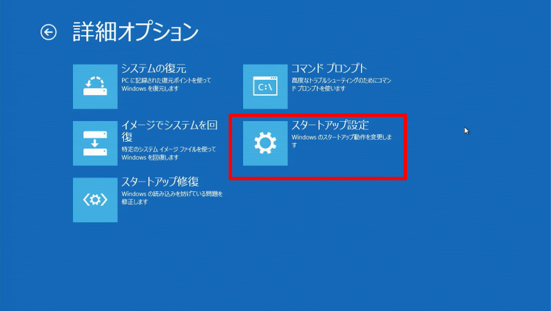 [回復]→PCの起動をカスタマイズするの[今すぐ再起動]をクリックします。