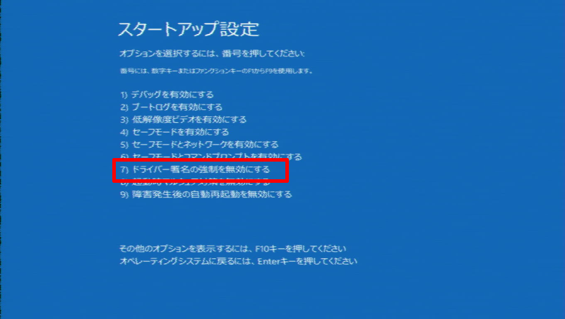 Windowsは、ドライバー署名の強制を無効化した状態で起動します。その後OSを再起動すると元の状態に戻ります。