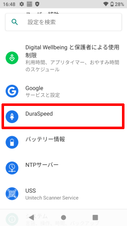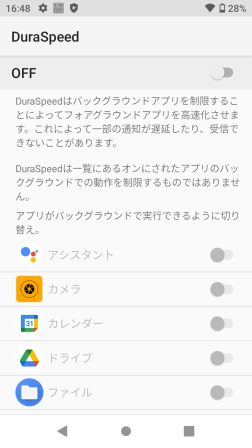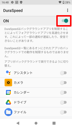 [DuraSpeed]は、バックグラウンドアプリを制限し、実行中のアプリを優先させることで動作を高速化させることができるオプションです。