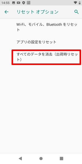 [設定]アプリを起動し、[システム]→[詳細設定]→[リセット オプション]→[すべてのデータを消去 (出荷時リセット)]をタップします。