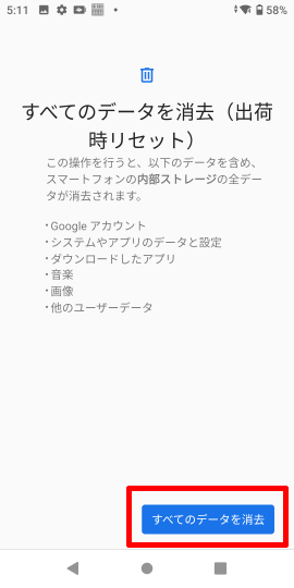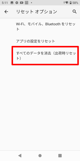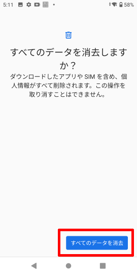 [](ボリュームアップ)キーと[](ボリュームダウン)キーを使用して[Factory data reset]を選択します。