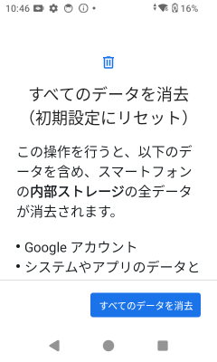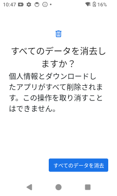 デバイスのリセット中は画面に[Wiping data]のメッセージが表示され、デバイスのリセットが完了すると元の画面に戻ります。