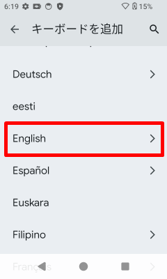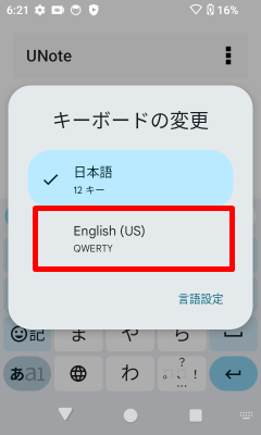 [English (US)]をタップし、英語キーボードに切り替えます。