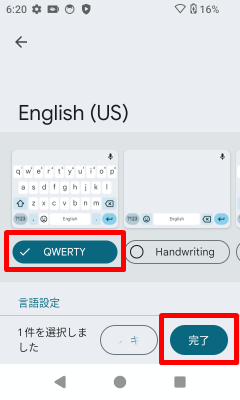 [QWERTY]を選択して[完了]をタップします。[English (US)]キーボードが追加されます。