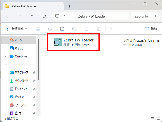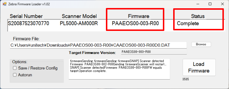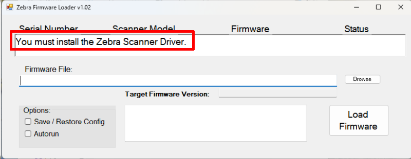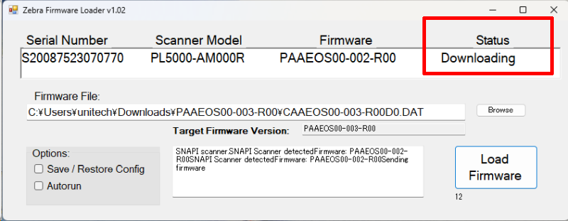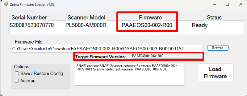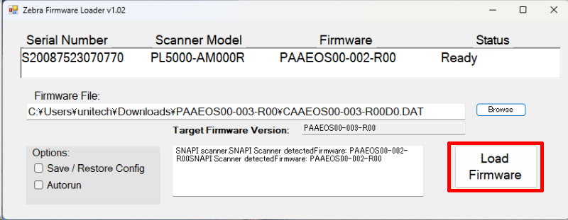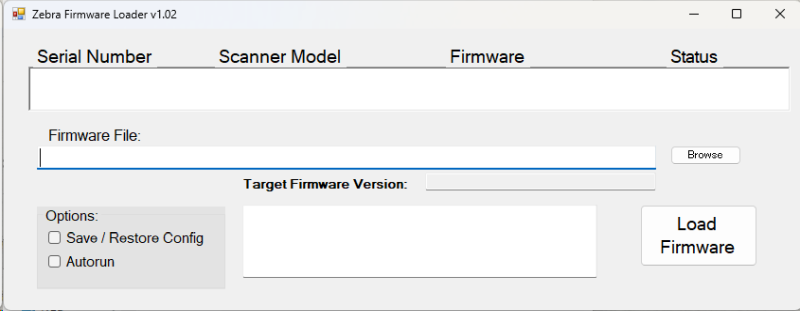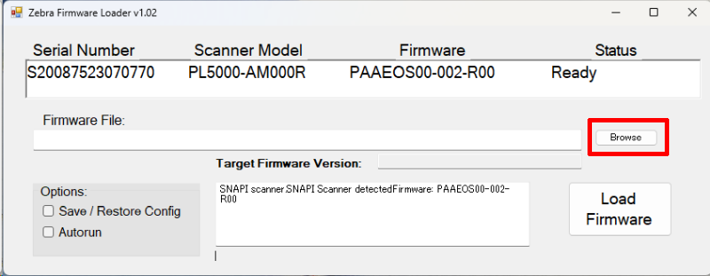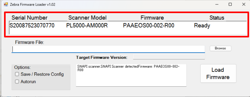Zebra FW Loaderは、ファームウェア更新用インターフェースに設定されているバーコードリーダーを自動的に検出し画面に表示します。