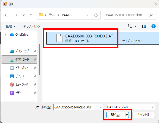 ファイル選択ダイアログが開きますので、更新用のファームウェアファイルを選択して開きます。