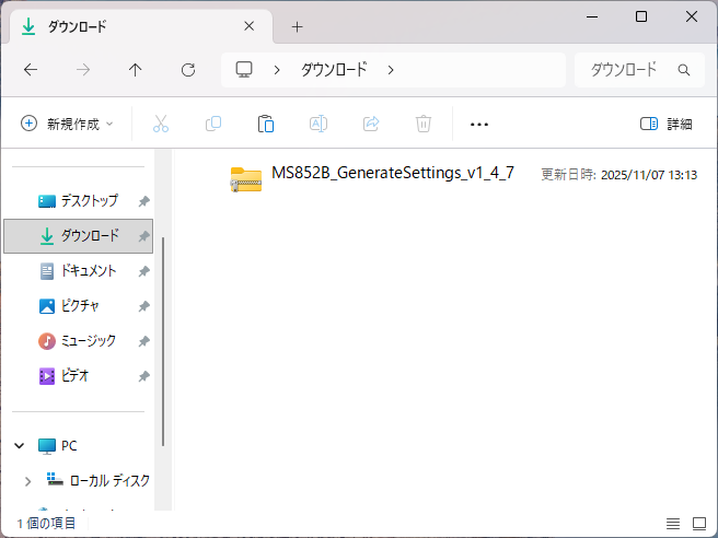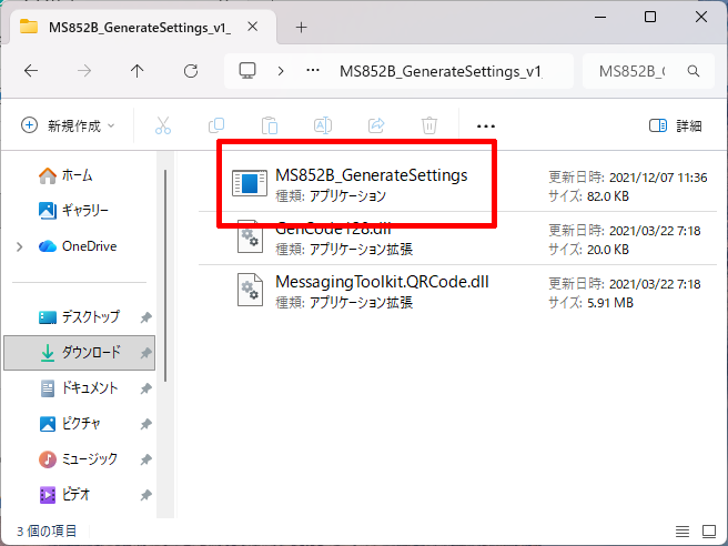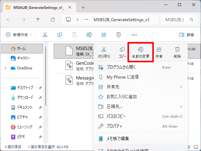 zipファイルを展開したフォルダが開きます。[MS852B_GenerateSettings.ex_]を右クリックして[名前の変更]を行います。