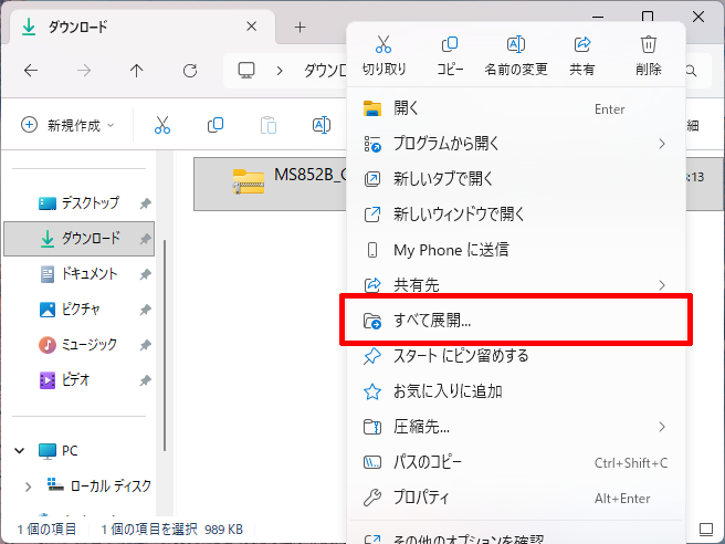 ダウンロードしたzipファイルを右クリックして[すべて展開]するか、zip解凍ソフトウェアを使用して解凍(展開)してください。