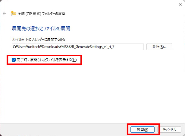 [完了時に展開されたファイルを表示する]にチェックを入れて、[展開]ボタンをクリックします。