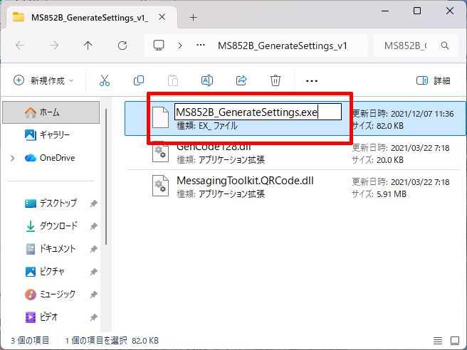 [MS852B_GenerateSettings.ex_]を[MS852B_GenerateSettings.exe]に変更し、Enterキーを押して確定します。