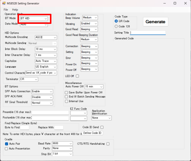 Operation Modeの[BT Mode:]を、現在のバーコードリーダーの接続方法に変更します。誤った接続方法で設定を作成すると、現在の接続情報すべてが失われ、ホストとの通信が切断されます。