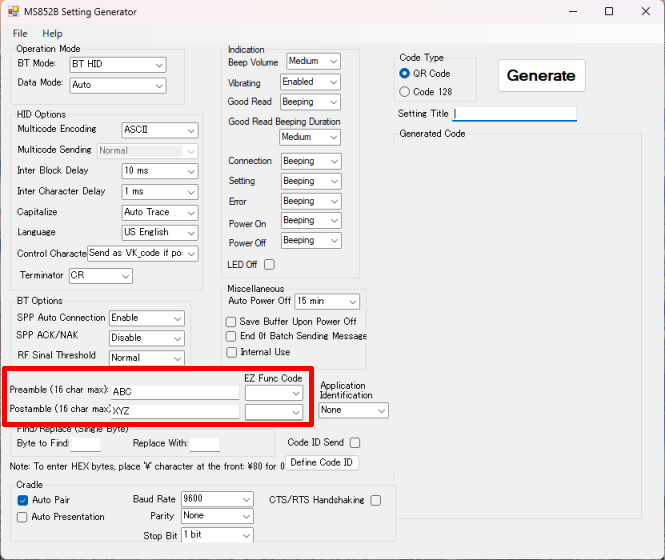バーコードデータの先頭に文字を挿入したい場合は[Preamble (16 char max):]へ、バーコードデータの末尾に文字を挿入したい場合は[Postamble (16 char max):]へ挿入したい文字を入力します。