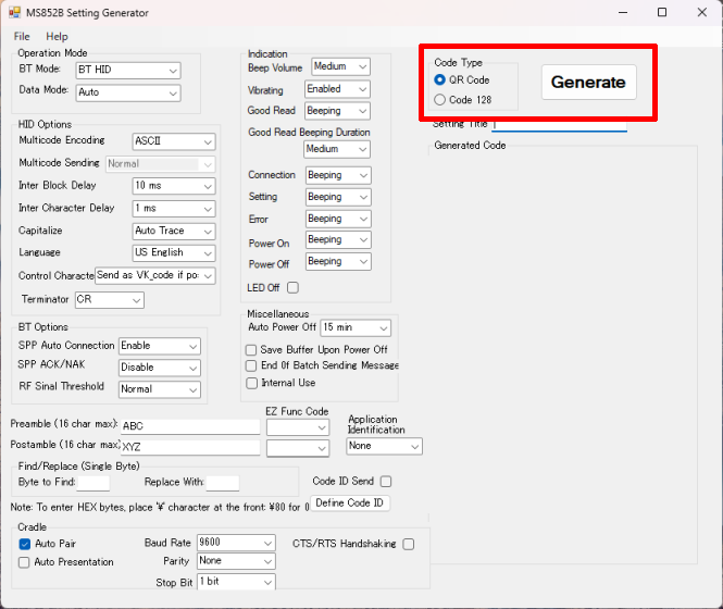 必要な項目の選択および入力が終了したら、[Code Type]を選択し、[Generate]をクリックします。