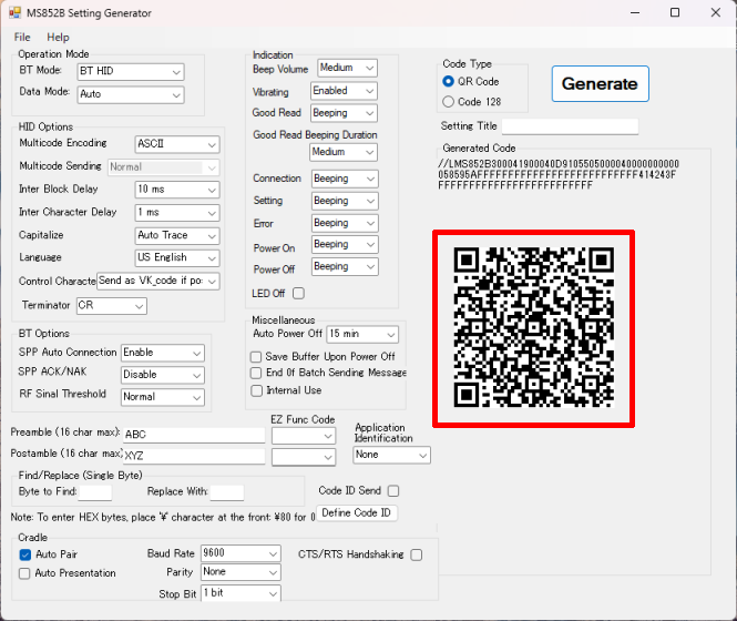MS852Bシリーズは、生成された画面上のQRコードをバーコードリーダーで読み取って設定完了です。