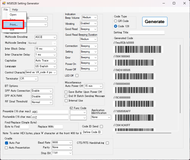 MS851Bシリーズは、[File]→[Print]から生成されたバーコードを印刷して読み取って設定完了です。