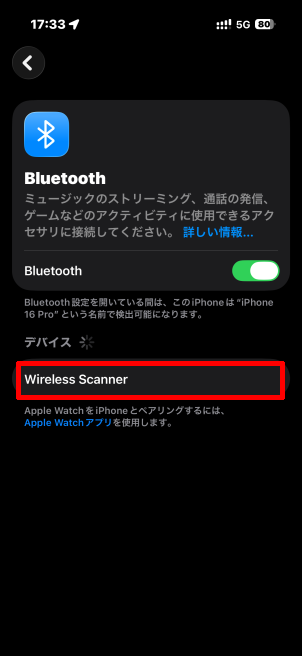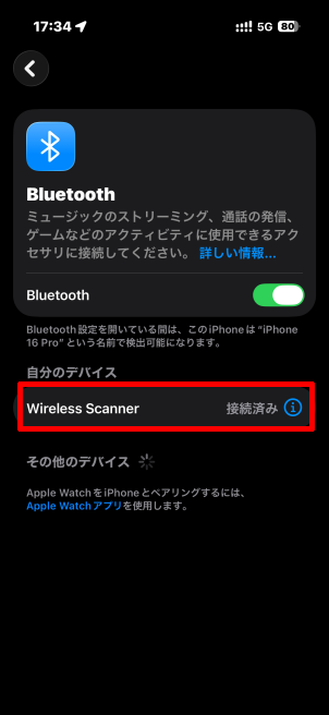 右に[]のないWireless Scannerが現れたらタップしてペアリングを開始し、[接続済み]になればペアリングは完了です。