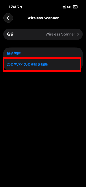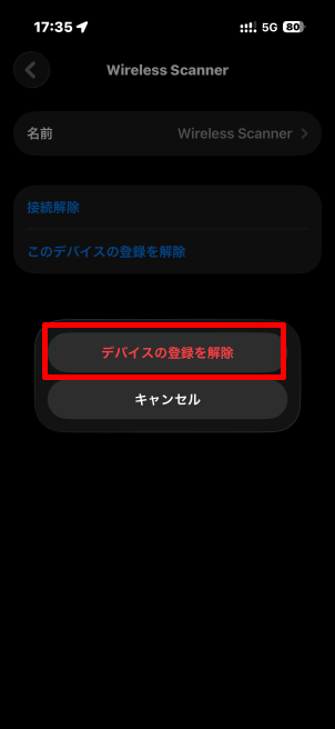 再ペアリング時など、以前の接続情報が残っている場合は、Wireless Scannerの右の[]→[このデバイスの登録を解除]→[デバイスの登録を解除]を行います。