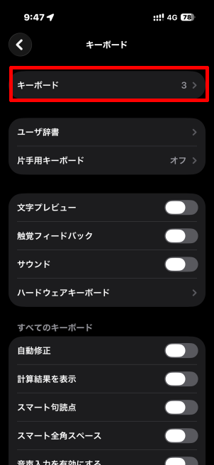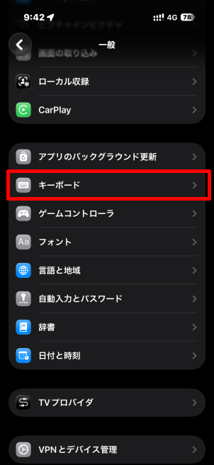 [ 設定]アプリを起動し[一般]→[キーボード]→[キーボード]を開きます。