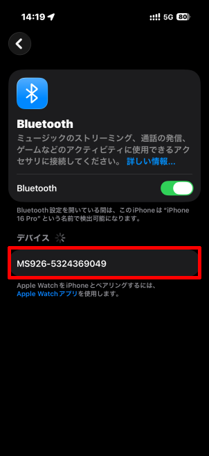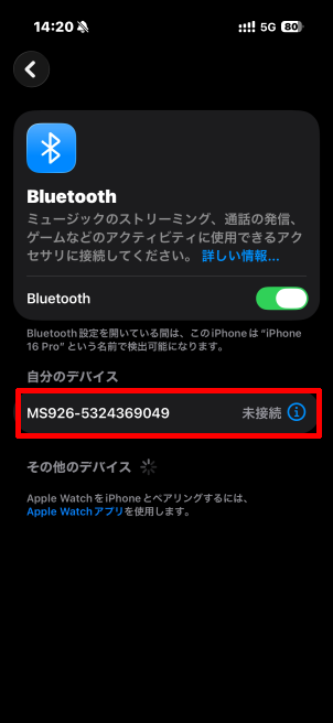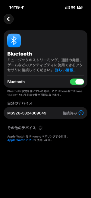 右に[]のない{デバイス名}が現れたらタップしてペアリングを開始し、[接続済み]になればペアリングは完了です。