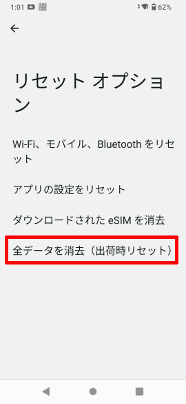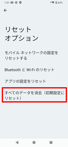 [設定]アプリを起動し、[システム]→[リセット オプション]→[全データを消去 (出荷時リセット)]をタップします。