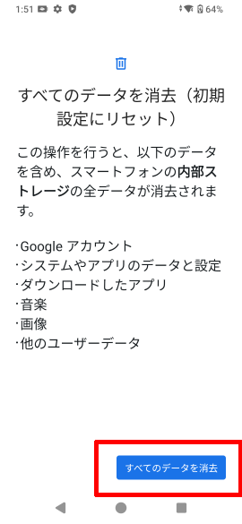 [](ボリュームアップ)キーと[](ボリュームダウン)キーを使用して[Factory data reset]を選択します。