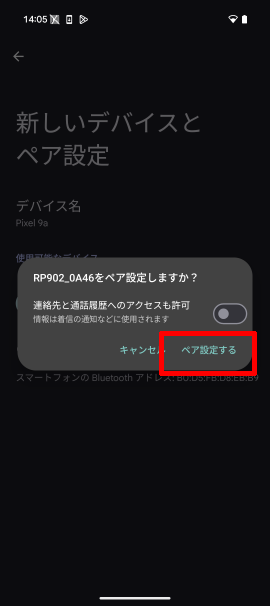 [RP902_xxxxをペア設定しますか?]のメッセージが表示されたら[ペア設定する]をタップしてペアリングを続行します。