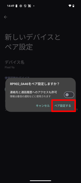 [RP902_xxxxをペア設定しますか?]のメッセージが表示されたら[ペア設定する]をタップしてペアリングを続行します。