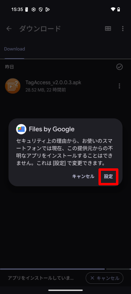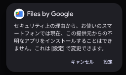 apkファイルをタップした後、下図の様なメッセージが表示される場合は、提供元不明アプリのインストールを許可してください。