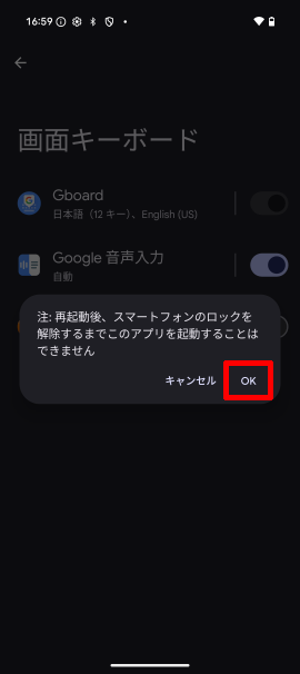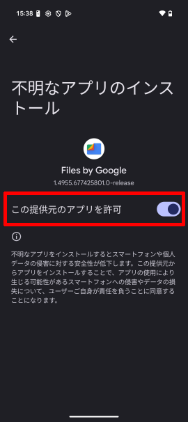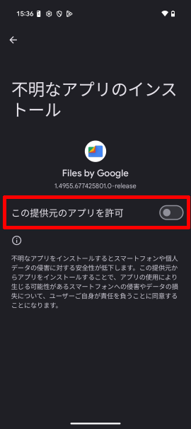 アプリのインストール後、このスイッチはオフの状態に戻すことをお勧めします。オンのままにしておくことはAndroidデバイスのセキュリティ上の理由によりお勧めできません。