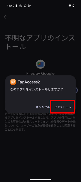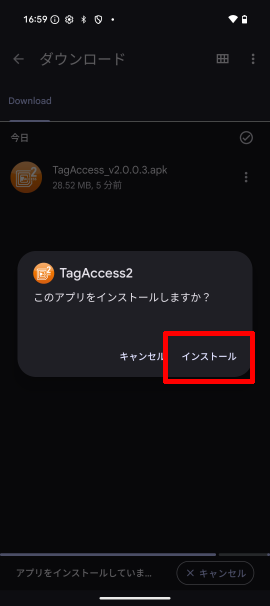 ダウンロードしたapkファイルをタップし、[インストール]をタップするとインストールを開始します。