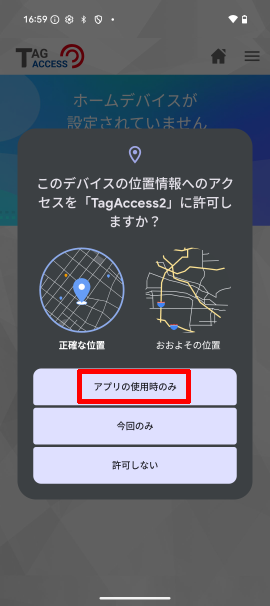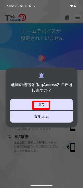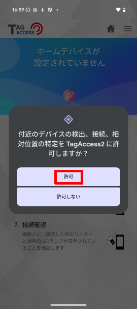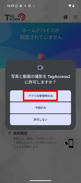 はじめてTagAccessを起動したとき権限の許可を求めるメッセージが表示されます。アプリがこれらの権限を使用できるように許可します。