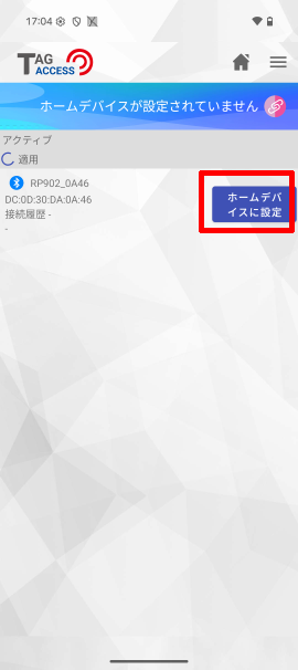 これまでの設定がすべて正常に完了していれば、しばらくするとペアリングしたRP902のデバイス名と、その右に[ホームデバイスに設定]ボタンが表示されます。[ホームデバイスに設定]をタップしてリーダーに接続します。