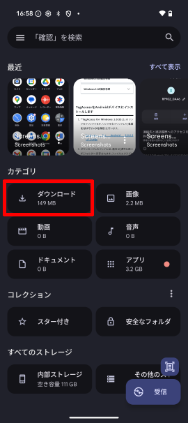 Androidデバイスで直接ダウンロードしたファイルは、通常はAndroidデバイスの[ダウンロード]フォルダへ保存されます。Androidデバイスのファイルラーアプリを起動し、[ダウンロード]へ移動します。