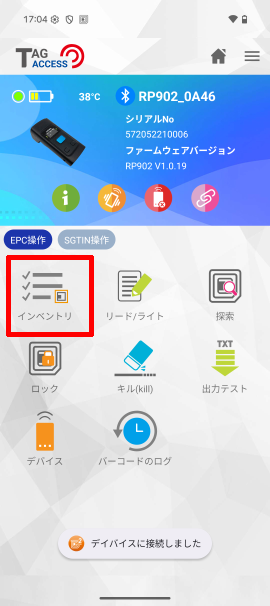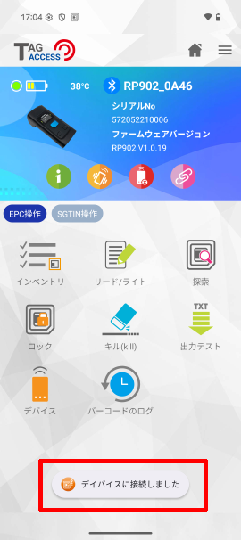 接続が完了するとリーダーからビープ音が鳴り、Androidデバイスに「デバイスに接続しました」とトーストメッセージが表示されます。アプリの画面の上部に表示されたデバイス画像の左上、バッテリ残量アイコンの左にリーダーとの接続状態を表示します。(緑=接続中、赤=切断中)