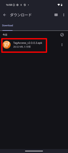 TagAccessをインストールするAndroidデバイスでこのページを開き、「TagAccess for Android 2.0.0.3」のリンクをクリックしてファイルをダウンロードします。または、PCでダウンロードしてからAndroidデバイスにコピーします。