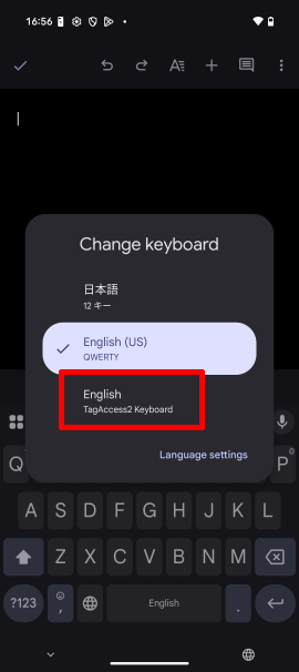 画面キーボードを表示させ、[]をロングタッチ→[TagAccess2 Keyboard]をタッチし、画面キーボードをTagAccess2 Keyboardに変更します。