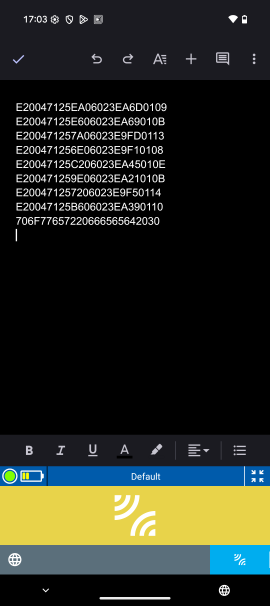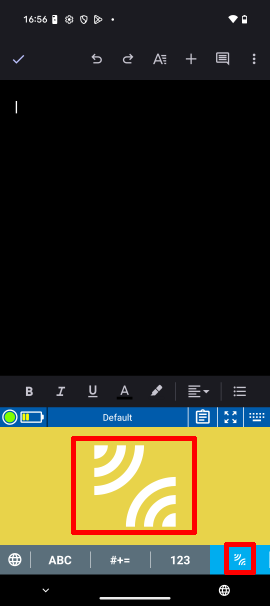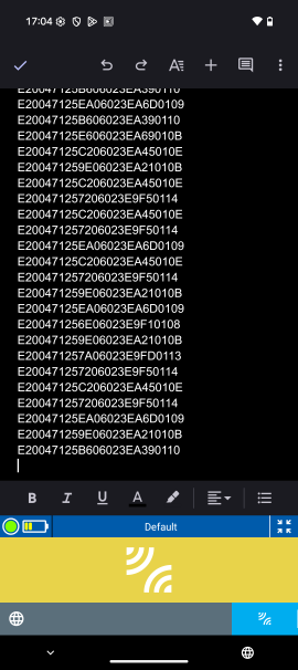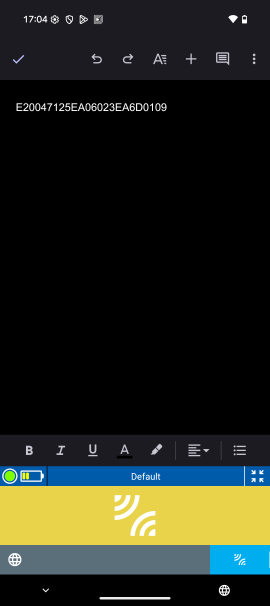 キーボード右下のアンテナアイコンをタップしてキーボードを読み取りボタンに切り替えます。読取りボタンをタップするとリーダーが読み取ったデータをアプリに出力します。